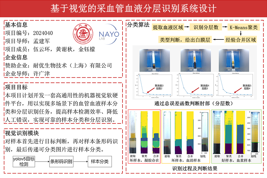 本项目计划开发一套高通用性的机器视觉软硬件平台,用以实现多场景下的血管血液样本分类和分层识别任务。该平台可服务于医疗机构、实验室等检测场景,提高样本检测效率、降低人工错误,实现可靠的样本分类和分层识别。本项目由三个主要部分组成:样本检测硬件平台;嵌入式系统及交互模块;视觉识别模块。计划在嵌入式平台上实现图片在线标注和检测结果评估等功能,并提供具有良好交互性的用户界面。