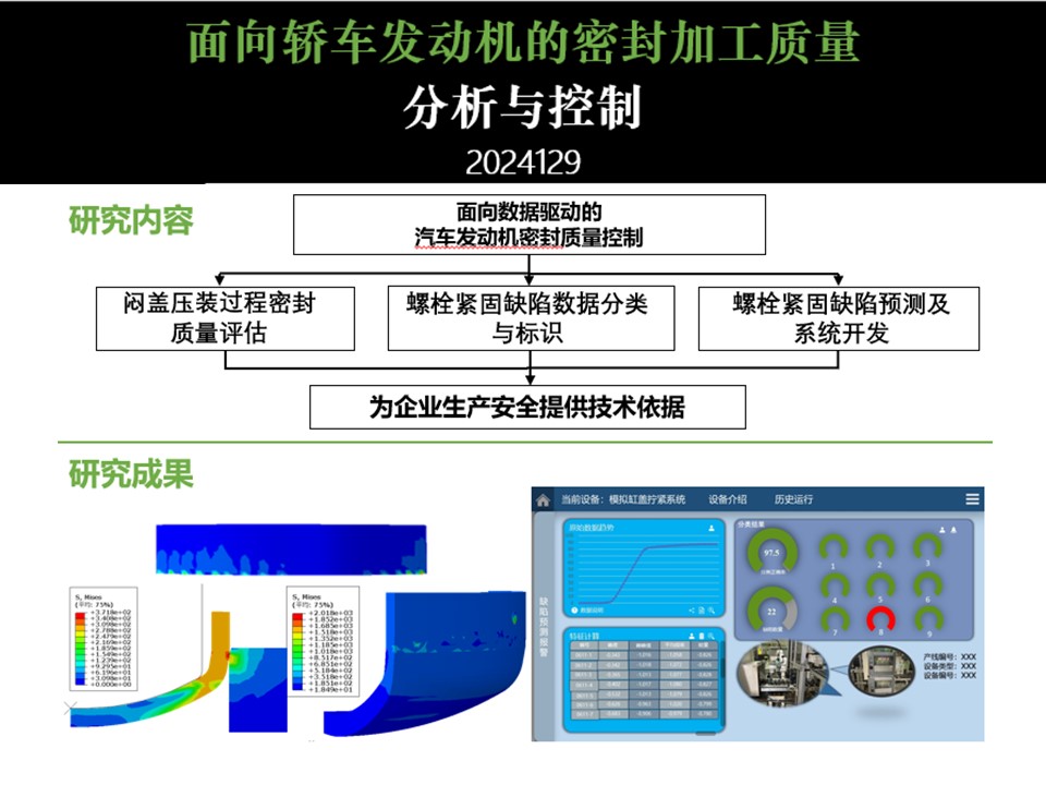本项目成功构建了闷盖压装过程的数值仿真模型,深入分析了压装界面压力与载荷的关联规律,并考虑了预变形和加工偏差对压装质量的影响。通过参数化优化,提出了闷盖压装质量改善的技术途径,为发动机密封工艺的质量提升提供了有力支持。利用多种机器学习算法及神经网络模型实现了对缸盖螺栓拧紧缺陷进行预测,并进行模型优化设计,提升模型的使用价值。模型可视化UI的构建,对模型的预测结果,能够实时在UI中进行显示,为工作现场的工作人员提供预测结果作为技术参考。