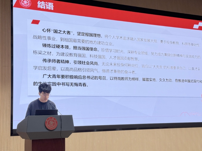 机器人所研究生第一团支部书记张若珩以“学习伟大抗战精神”为主题,结合抗战胜利80周年重要背景,系统阐述了抗战精神的核心内涵,引导团员将爱国情怀与民族气节融入科研创新与个人成长。第三团支部书记周成元带领学习习近平总书记给特岗教师的重要回信精神,鼓励团员立足专业、服务国家需要。第二团支部书记苟栩宁开展国家安全专题教育,强化团员法治意识和风险防范能力。机电所研究生团支部书记宋旭阳围绕树立正确就业观进行分享,倡导青年在祖国最需要的地方实现价值。
