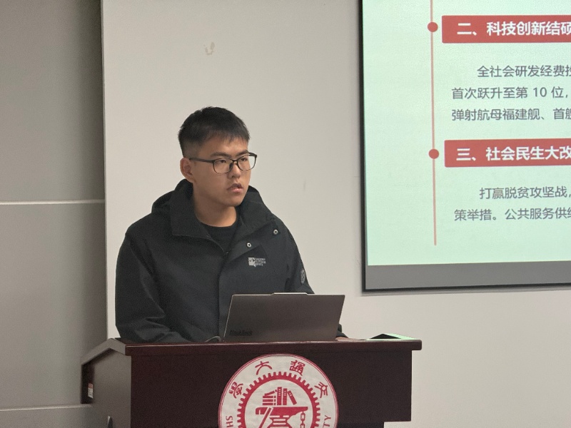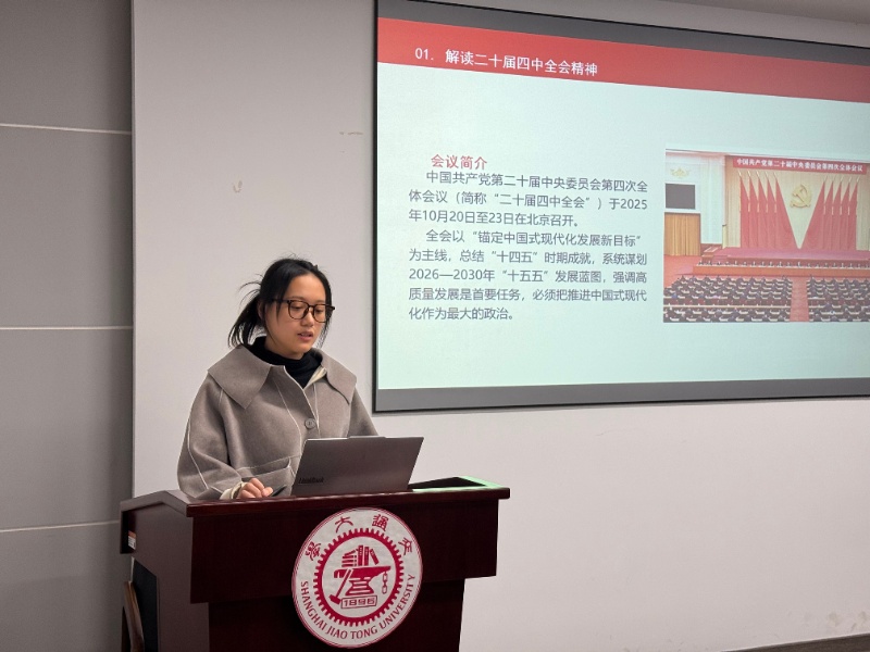 支部十二位新生党员围绕“解读二十届四中全会精神,回顾十四五期间的重大成就,总结十五五期间制定的战略目标”这一系列内容进行了微党课分享。首先,杨冰涵、赵梓炎以《贯彻四中全会精神:回顾“十四五”、展望“十五五”》为题,系统梳理了二十届四中全会就推进国家治理体系和治理能力现代化作出的战略部署,全面回顾了“十四五”规划在经济发展、科技创新、民生保障等领域取得的决定性成就,并展望了“十五五”时期加快构建新发展格局、推动中国式现代化取得新进展的目标任务。